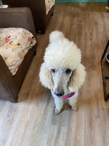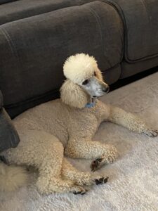 The day everything changed. 🏡 This was me at Carolina Poodle Rescue — freshly groomed, still a little uncertain, and waiting for my forever family. I didn’t know it then, but this photo was taken just hours before I headed to my new home and a whole new life. Want to read the full story of how I was adopted? Check out The Day Everything Changed. | Handsome guy catching his show. 📺 Not every TV session is a full-scale stakeout. Sometimes I just stretch out, get comfy, and enjoy the show like any civilized poodle would. Calm, composed, and casually adorable — that’s me in downtime mode. |